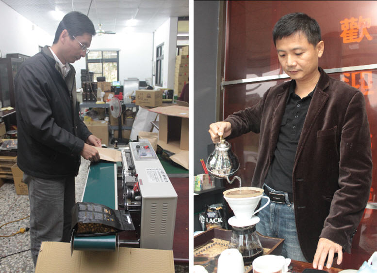 华南国小校长陈清圳(左)亲自为义卖的三地门咖啡进行包装,在徐饴鸿(右)的烘焙加工下,这批三地门咖啡豆充分展现台湾咖啡特有的果香。